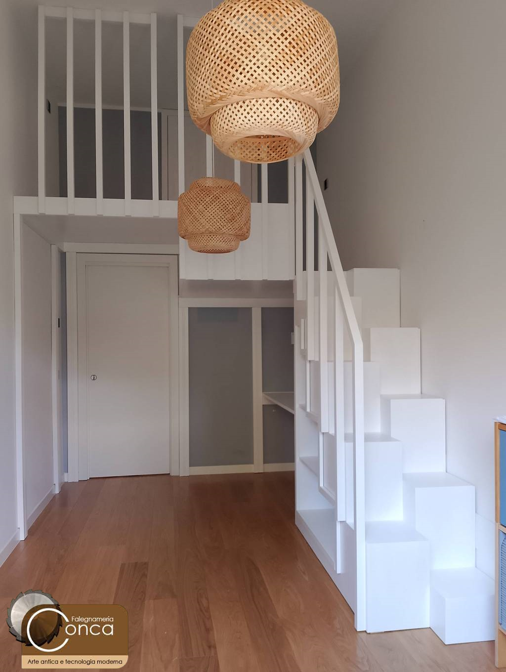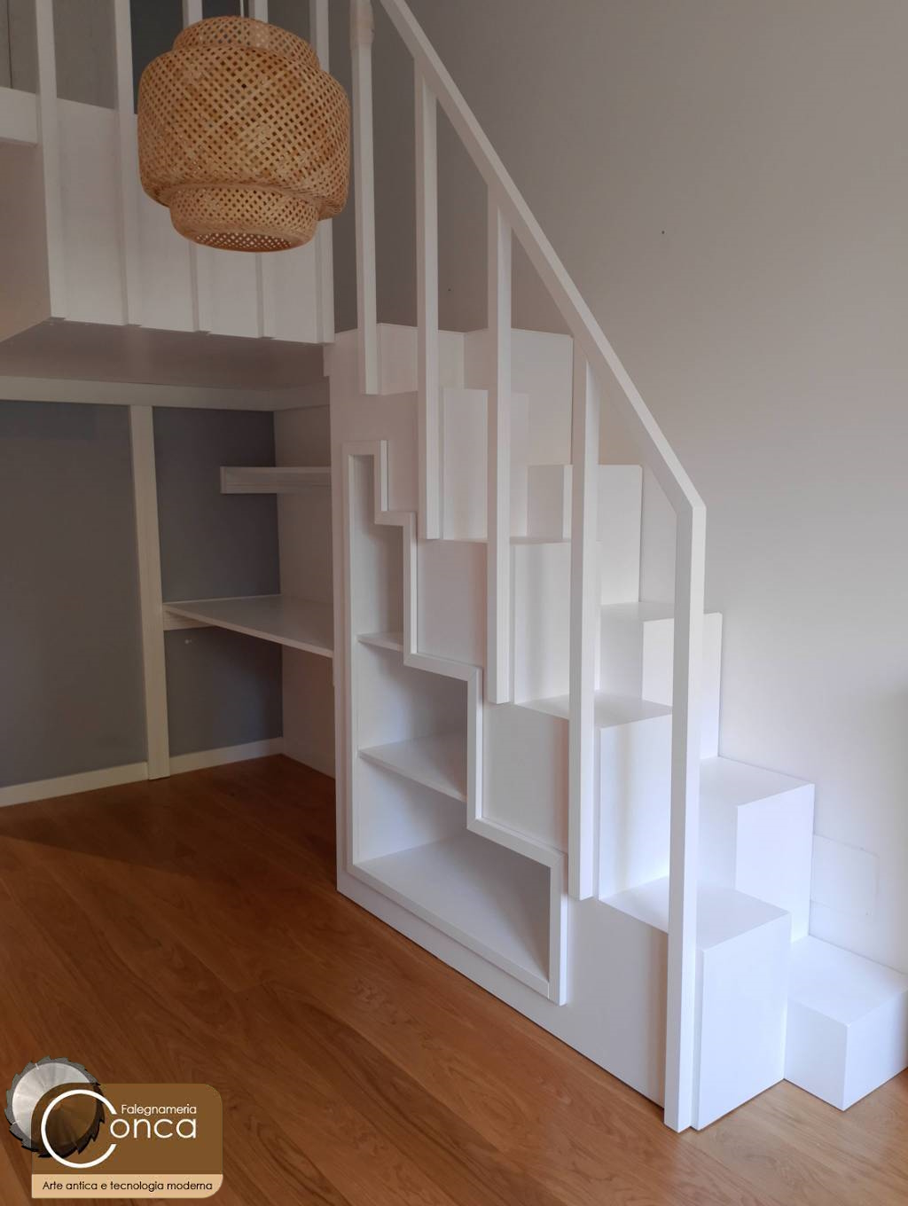 Nel video un esempio di una soppalco su misura in legno di frassino bianco, con scrivania e mensole sottostanti e scala a cubi sfalsata per sfruttare due ambienti contemporaneamente.